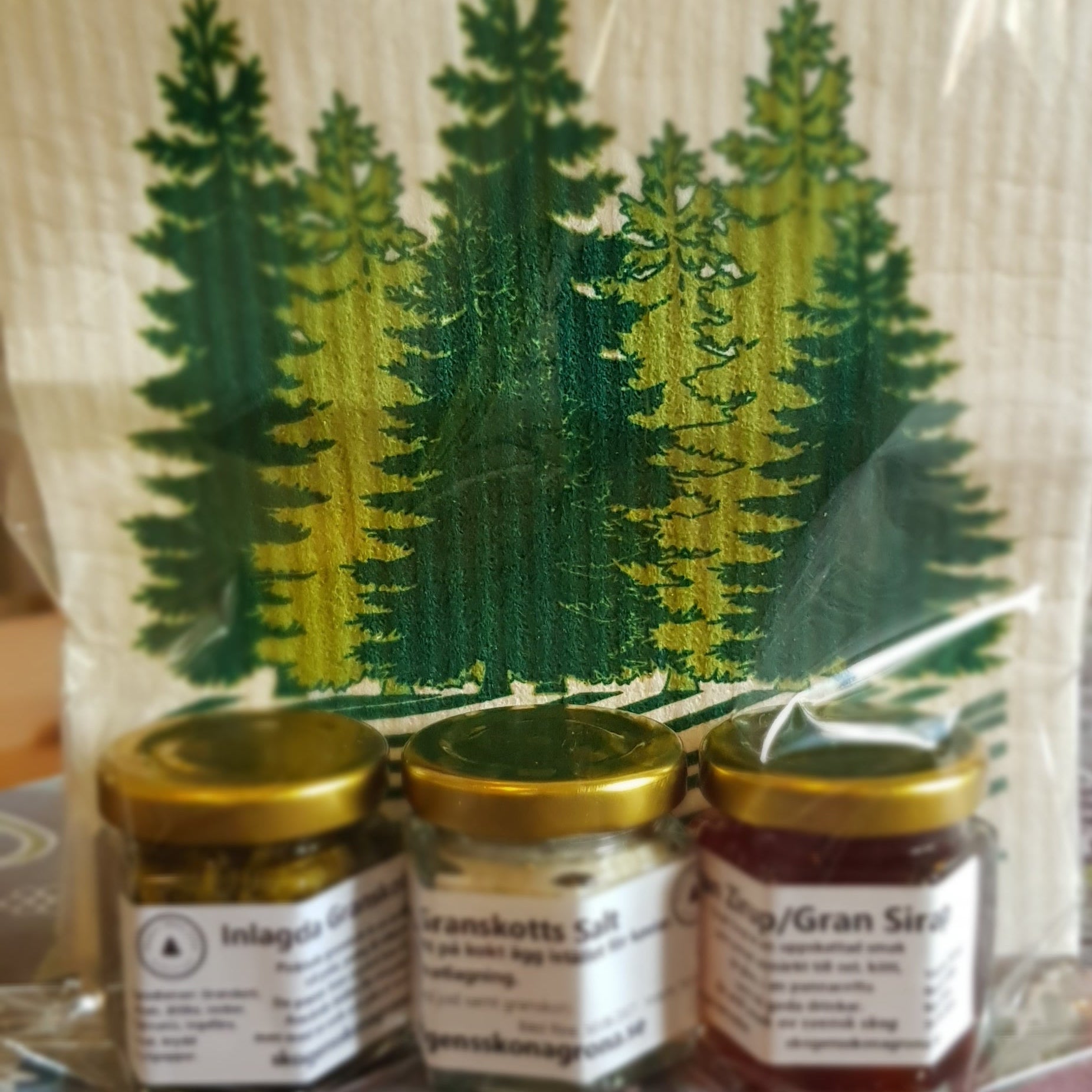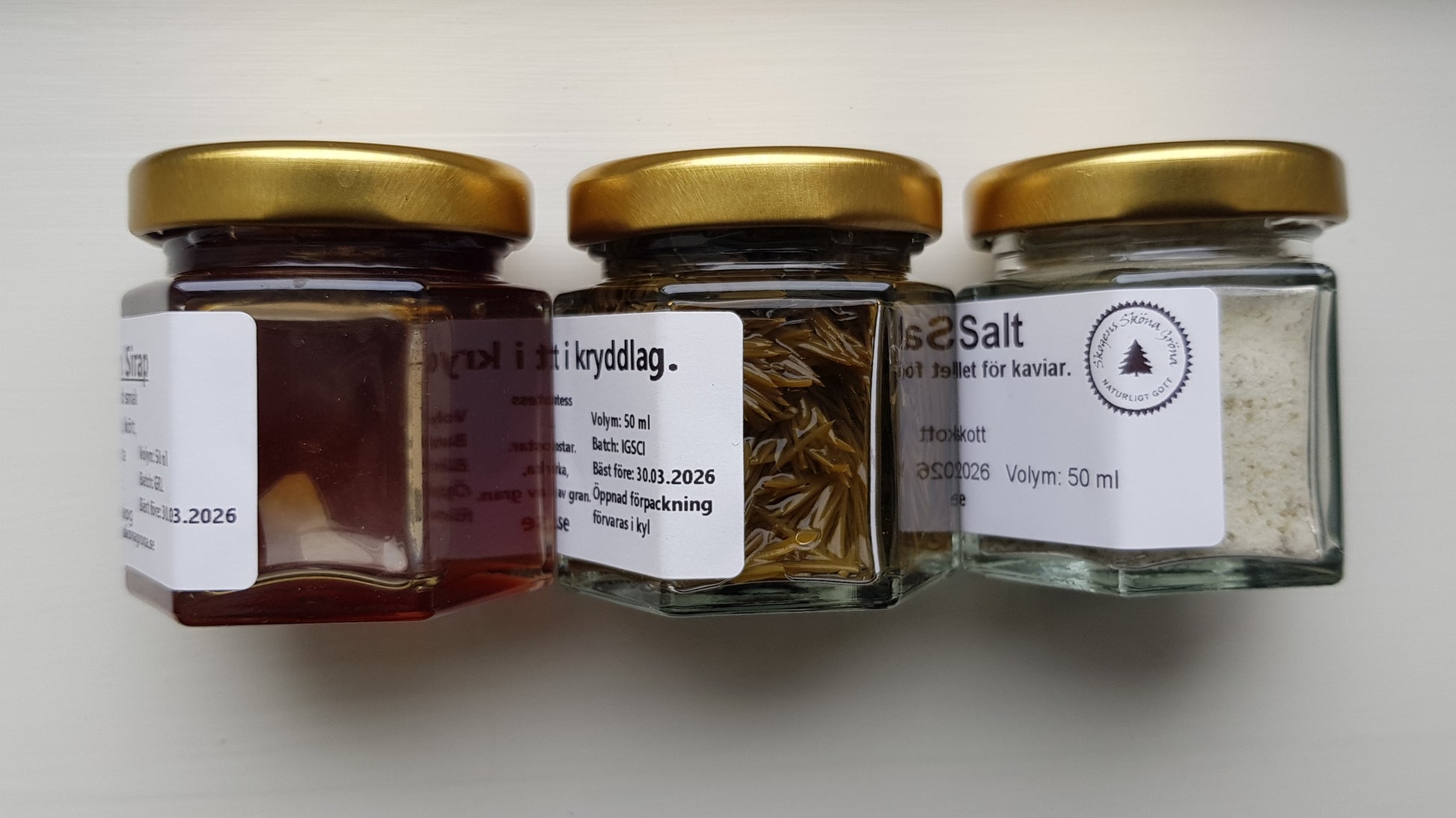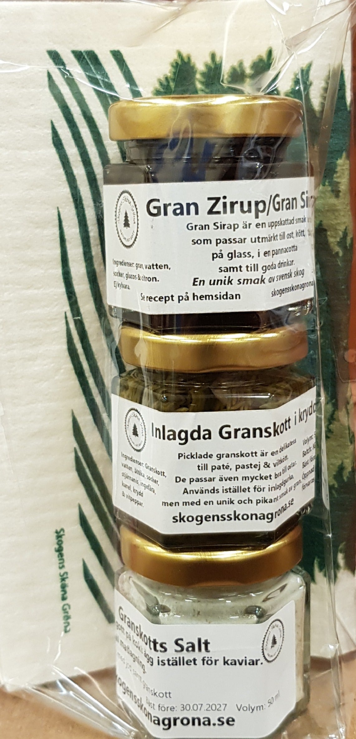 3 x 50 ml av Gran Zirup, Inlagda granskott samt Granskottssalt.