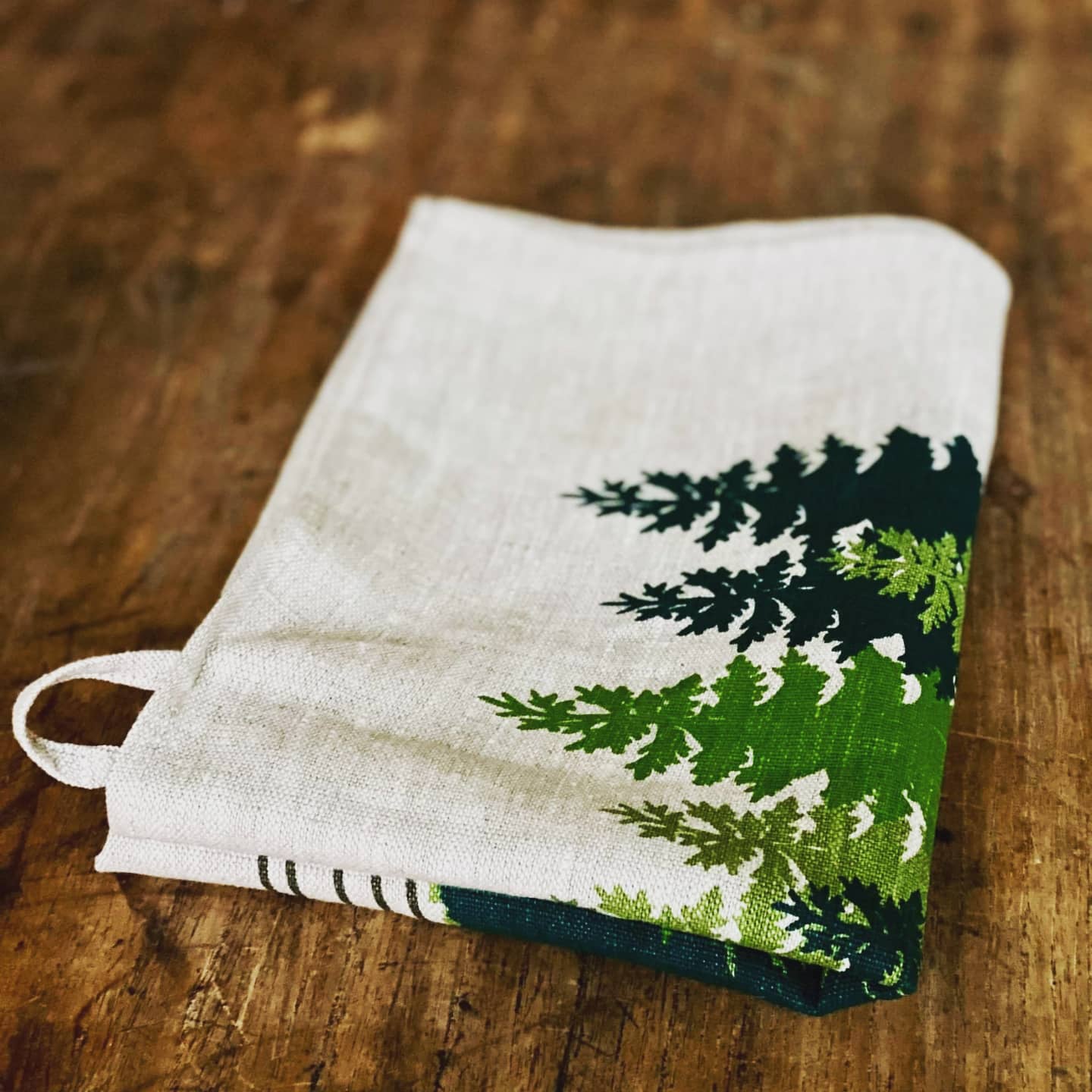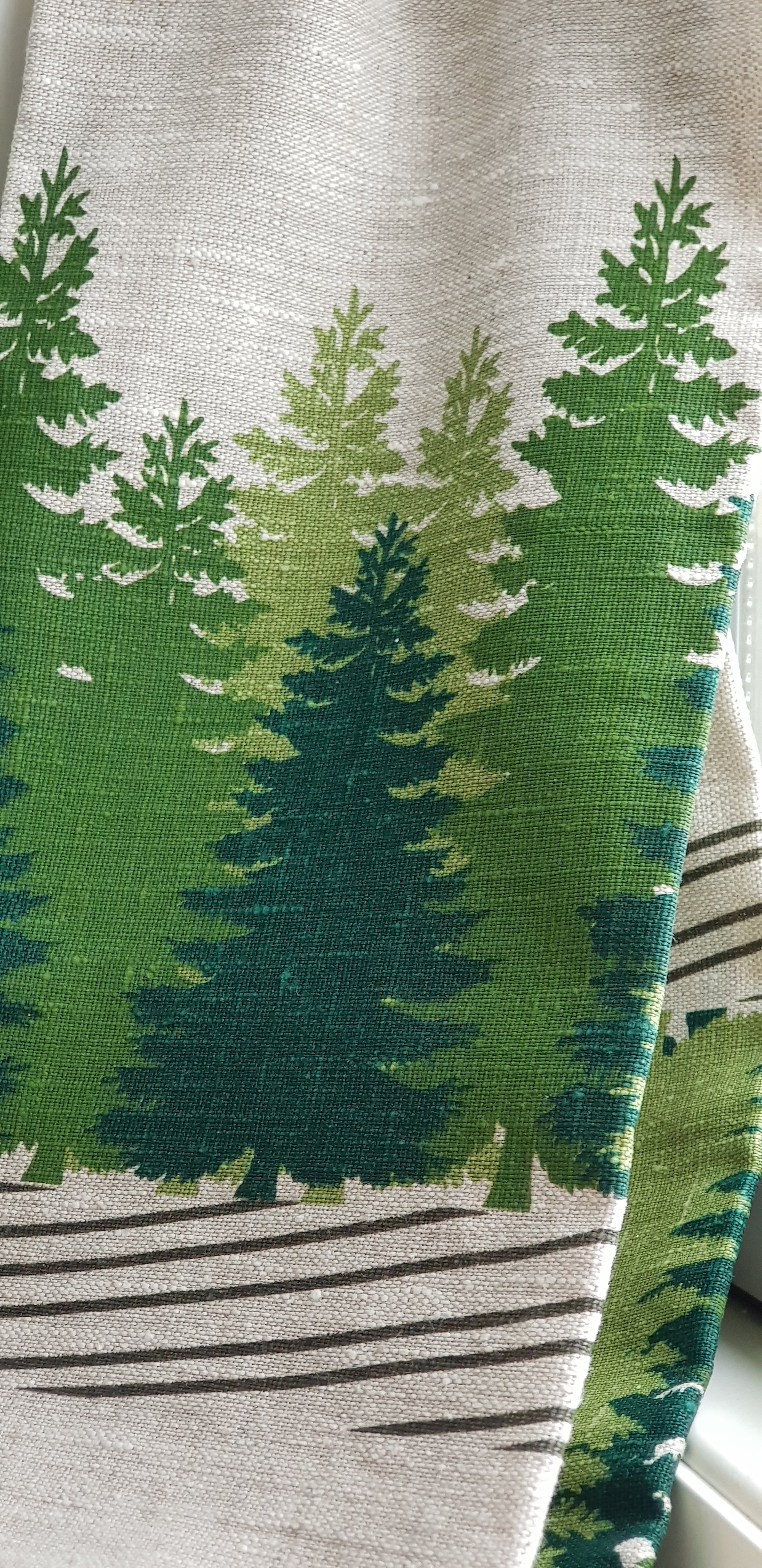 En mycket snygg kökshandduk i 100 % lin, med granskogen som motiv.