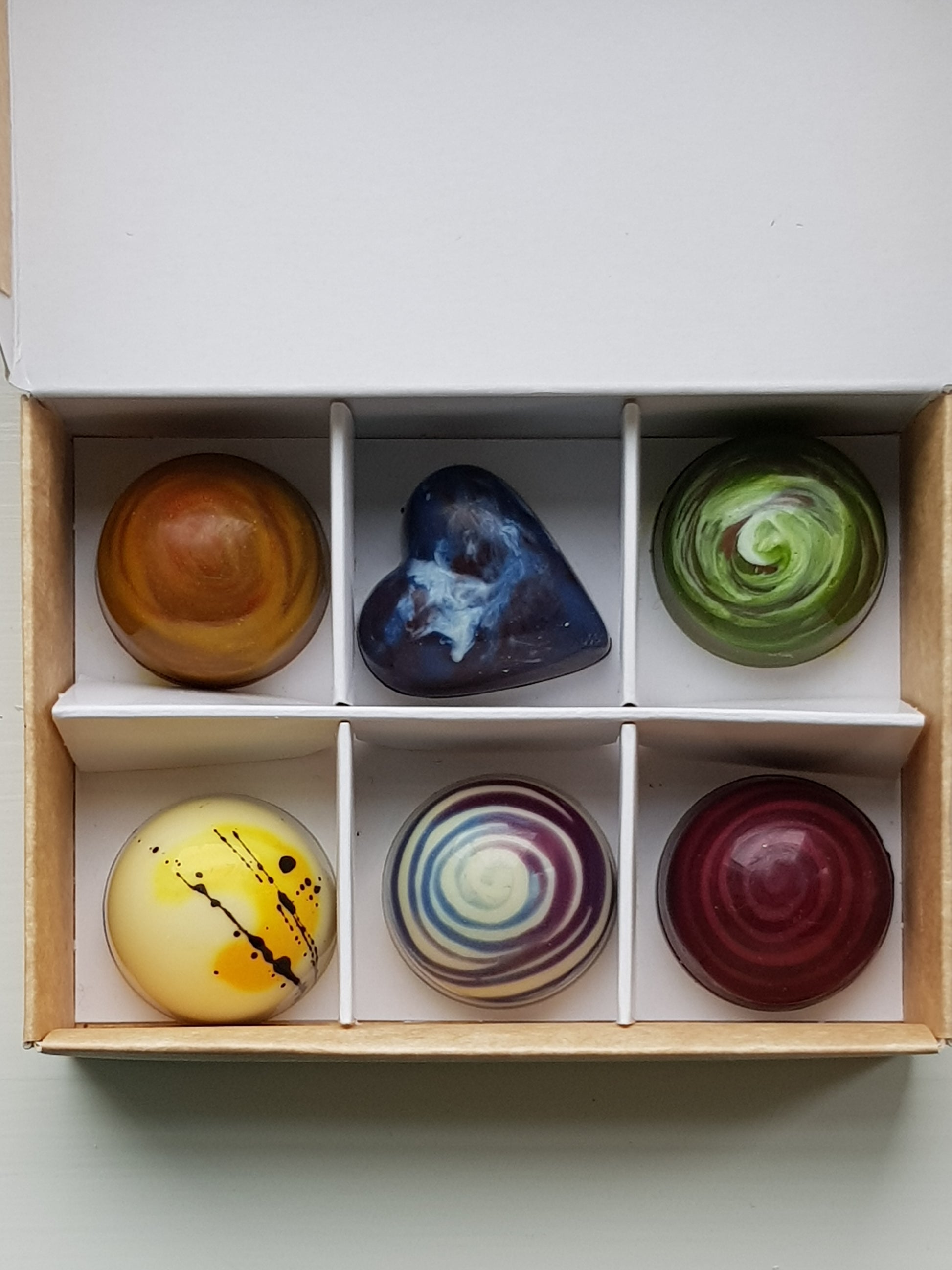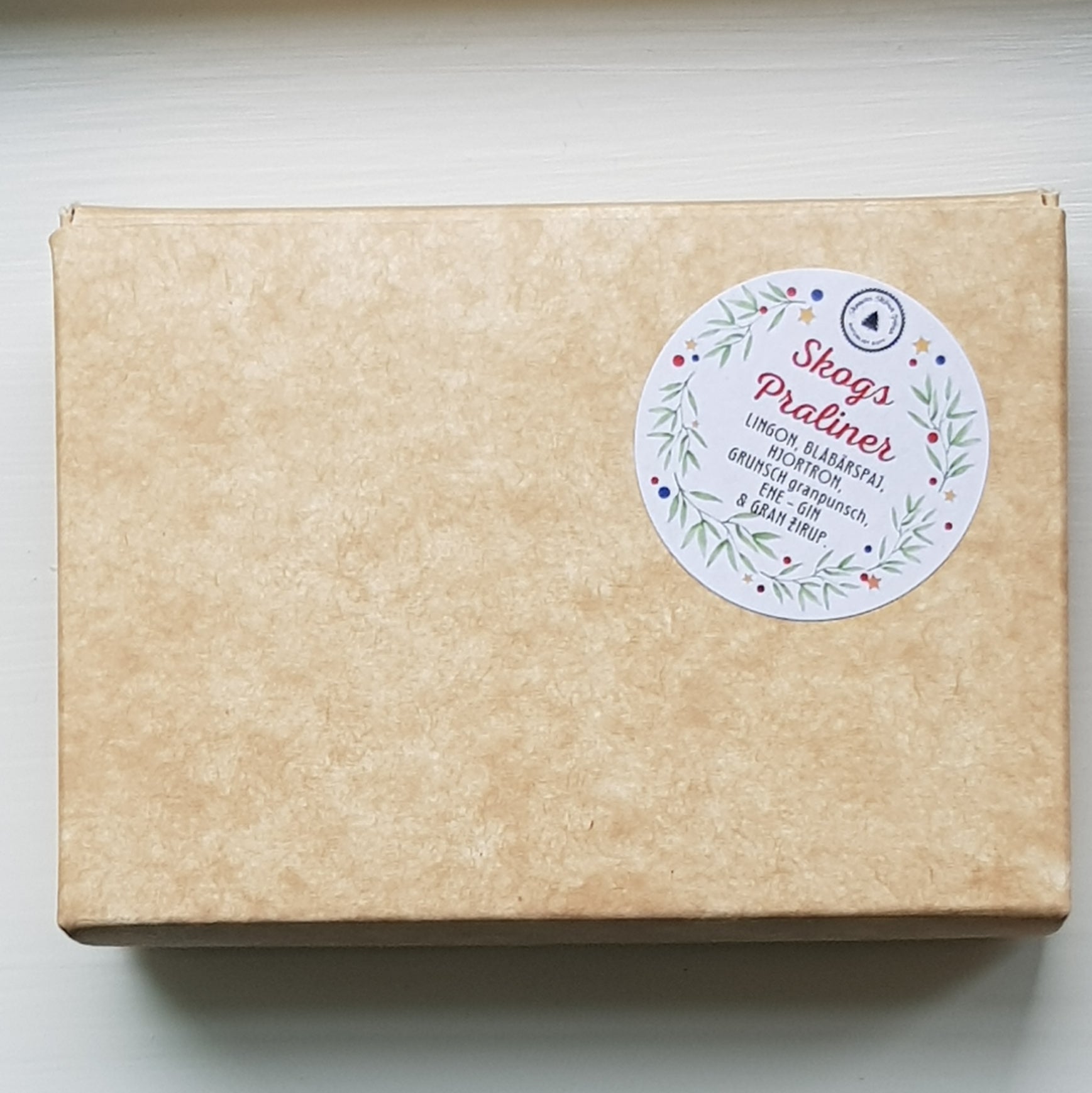 6 stycken fantastiska skogspraliner i skogssmakerna Hjortron, Lingon, Blåbärspaj, Grunsch, Gran Zirup och Ene/Citron Gin.